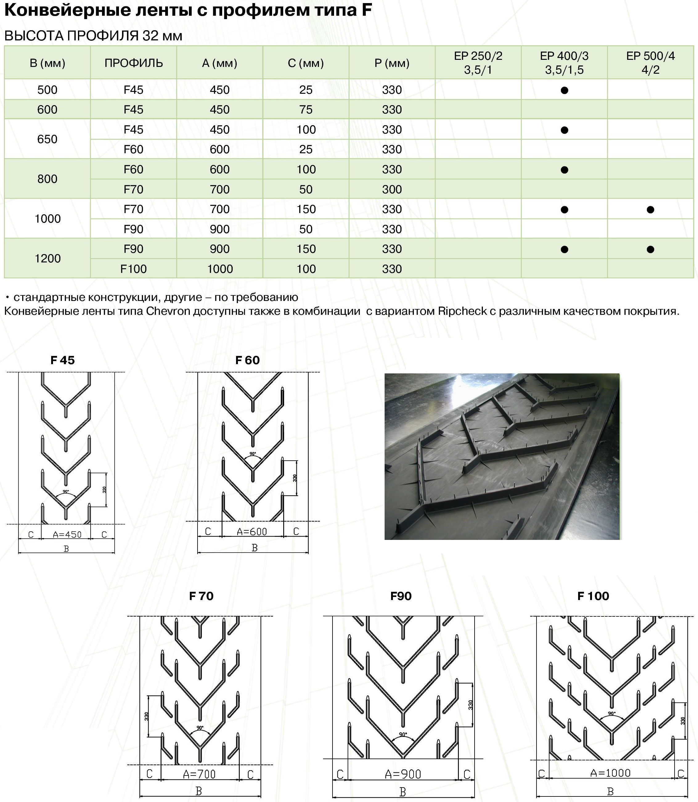 В зависимости от транспортируемых грузов и угла наклона производится подбор ленты и высота шеврона:
